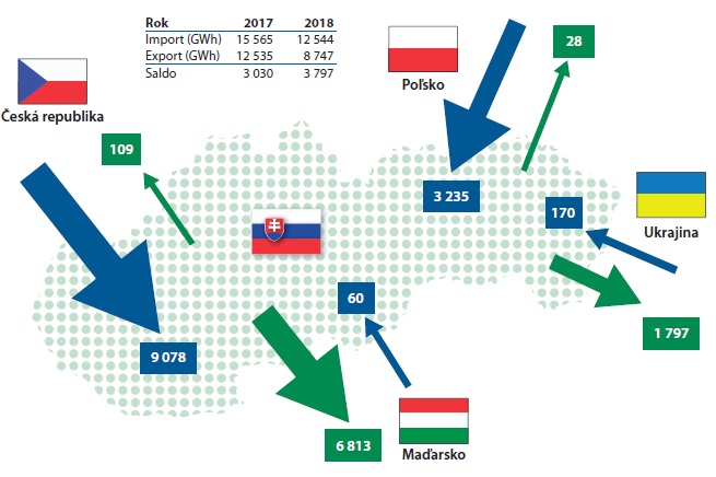 Cezhraničné toky elektriny v 2018 v GWh, zdroj: SEPS