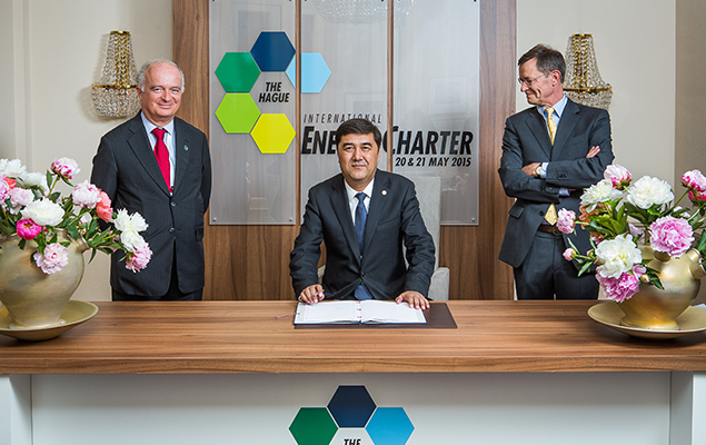 Nuer Baikili, podpredseda čínskeho národného úradu pre energetiku, podpisujúci deklaráciu o medzinárodnej Energetickej Charte