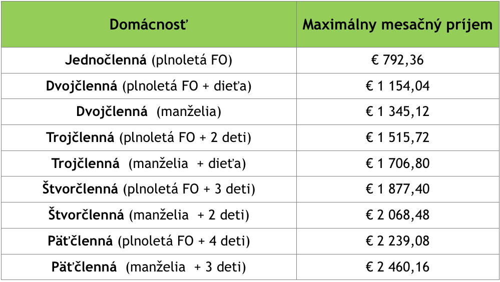 *mesačný príjem žiadateľa a osôb ktorých príjmy sa posudzujú spoločne za predchádzajúci rok (vypočíta sa ako podiel z príjmu za predchádzajúci kalendárny rok a príslušného počtu mesiacov, za ktoré tento príjem patril) nesmie prekročiť štvornásobok životného minima na domácnosť žiadateľa