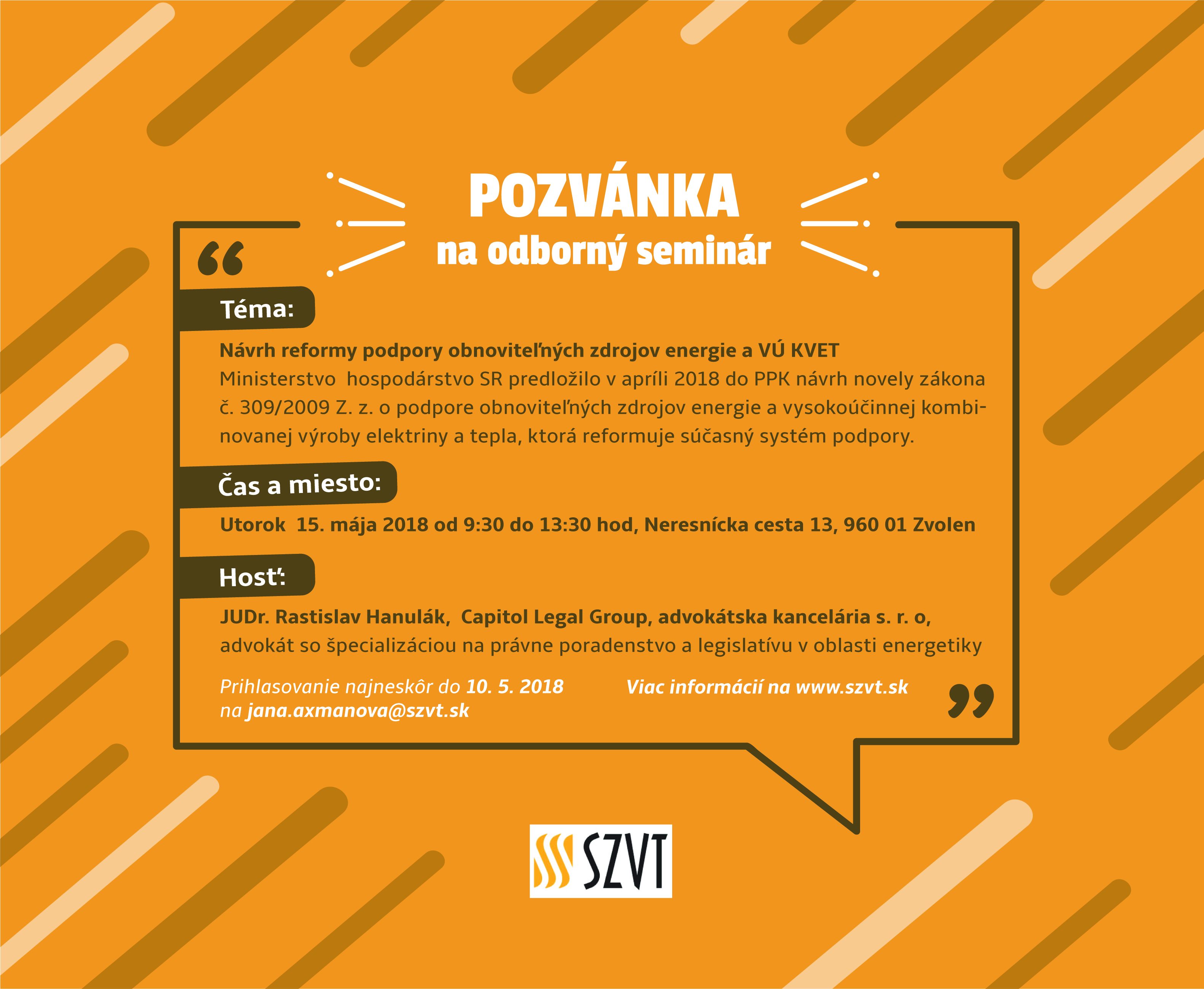 „Pre vysvetlenie povinností, zmien a príležitostí vyplývajúcich z novely zákona pripravil SZVT odborný seminár, na ktorom chceme prebrať kľúčovú filozofiu reformy, systém navrhovanej podpory pre nové zariadenia pre výrobu elektriny z OZE, aukcie na nové zariadenia výroby elektriny z OZE a KVET, systém lokálnych zdrojov, výkupu elektriny a prevzatia zodpovednosti za odchýlku, doplatok a príplatok, prechod na zúčtovanie podpory zúčtovateľom podpory a súvisiace zmeny zákona č. 251/2012 Z. z. o energetike (G-komponent, neoprávnená dodávka elektriny ) a zmeny zákona č. 250/2012 Z. z. o regulácii v sieťových odvetviach. Na seminár je možné sa prihlásiť do 10. mája,“ povedal Stanislav Janiš, predseda Slovenského zväzu výrobcov tepla.