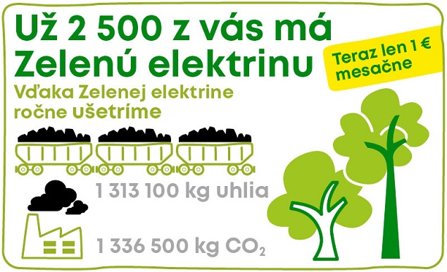 Tento veľký záujem vnímame aj u našich zákazníkov. Dnes máme viac ako 2 500 odberateľov Zelenej elektriny, ktorí planéte ročne ušetria 1 313 100 kilogramov uhlia a 1 336 500 kg oxidu uhličitého, ktorý každoročne prispieva k tvorbe skleníkových plynov a mení svet tak na nepoznanie.