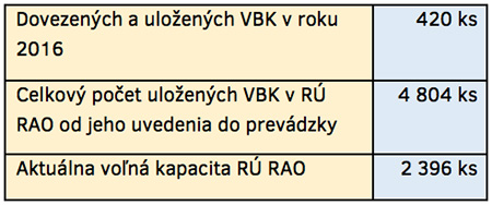 Spoločnosť JAVYS, a. s., v roku 2016 prepravila a následne uložila v Republikovom úložisku rádioaktívnych odpadov (RÚ RAO) Jadrovej a vyraďovacej spoločnosti, a. s., 420 kusov vláknobetónových kontajnerov (VBK) s nízkoaktívnym rádioaktívnym odpadom. Kontajnery majú rozmer 1,7 x 1,7 x 1,7 m a hrúbku steny 0,1 m a ukladajú sa do úložných boxov zoradených do radov a dvojradov úložiska. RÚ RAO je multibariérové úložisko povrchového typu, určené na konečné uloženie pevných a spevnených nízkoaktívnych rádioaktívnych odpadov, vznikajúcich pri prevádzke a vyraďovaní jadrových zariadení, ďalej napr. vo výskumných ústavoch, v laboratóriách a nemocniciach, ako inštitucionálne rádioaktívne odpady (IRAO) a zachytených rádioaktívnych materiálov (ZRAM) v Slovenskej republike. Od jeho uvedenia do prevádzky v ňom bolo uložených 4 804 ks VBK s rádioaktívnymi odpadmi. Ide o finálny úkon v reťazci nakladania s týmito látkami a ich bezpečnú izoláciu od životného prostredia.