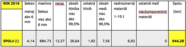 Prehľad materiálov odovzdaných na recykláciu a ich objemov v roku 2016
