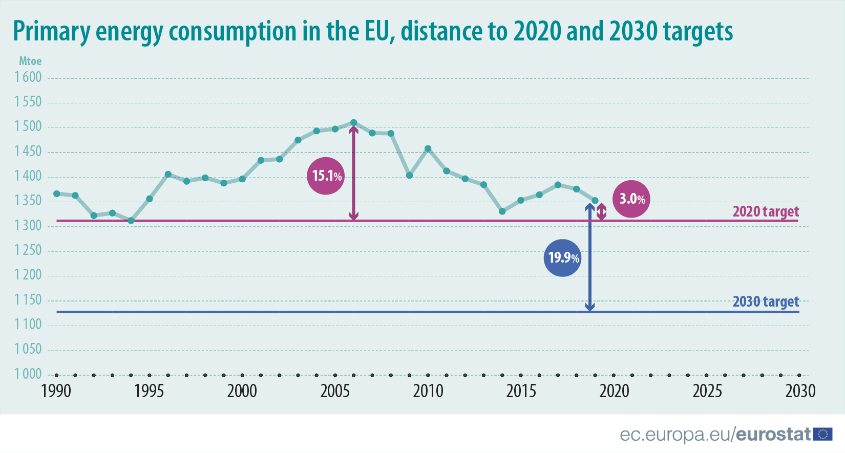 Vývoj primárnej energetickej spotreby EÚ s cieľmi pre roky 2020 a 2030, zdroj: EUROSTAT
